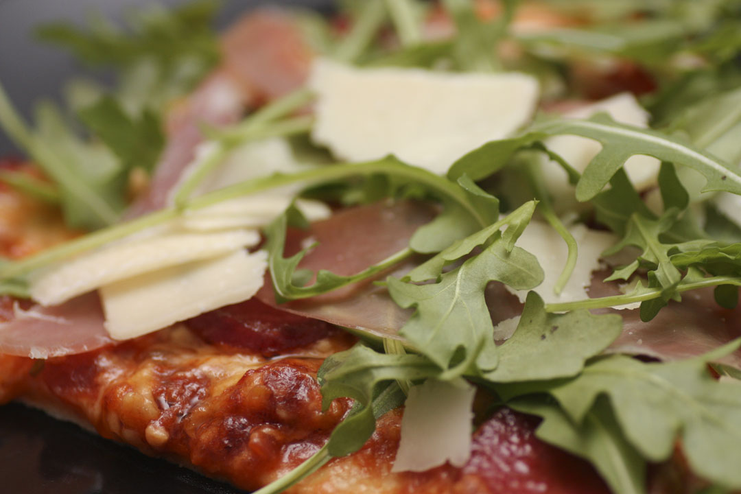 Efter att pizzan gräddas, lägger man på parmaskinka eller prosciutto skinka.