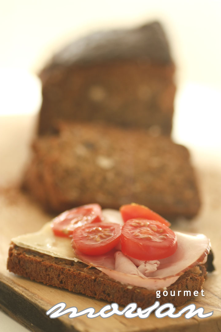 på nybakt grovt bröd som jag slängde ihop imorse.