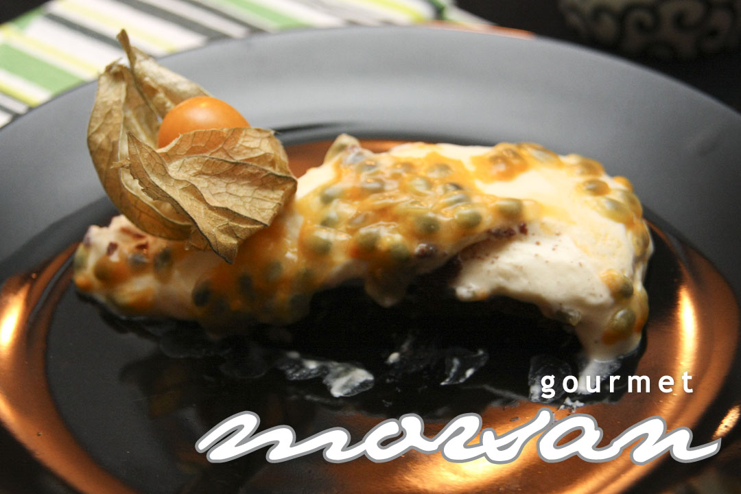 Dela passionsfrukten och skrapa ur fruktköttet. Häll det över