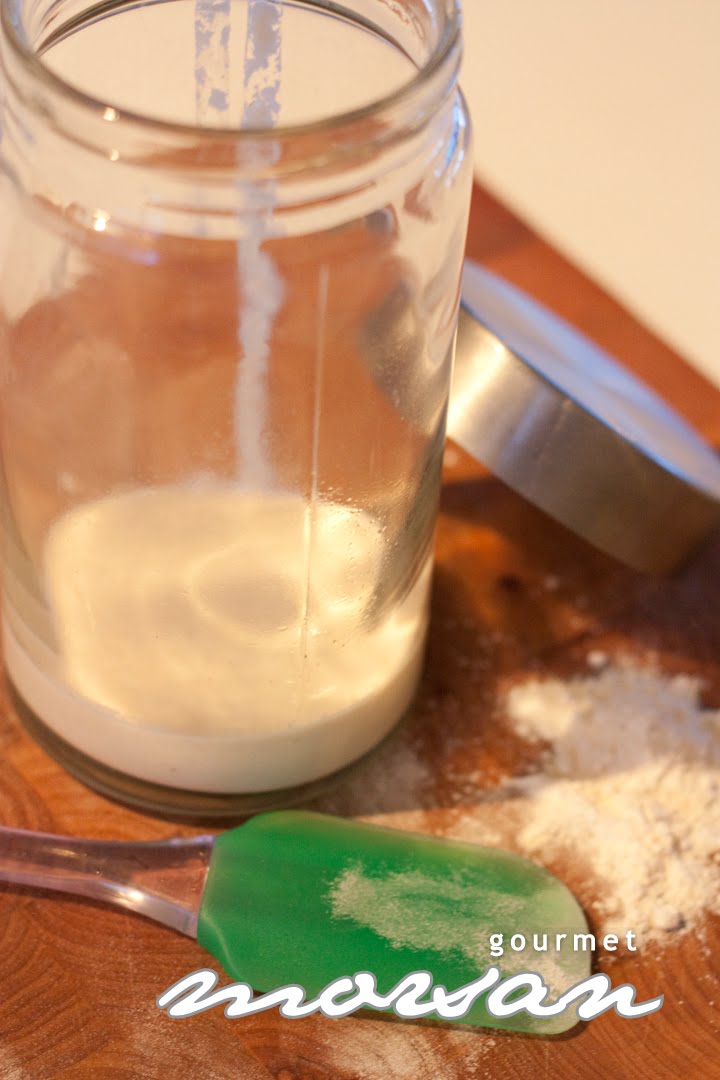 Och så in i kylen. Nu har du en surdegsgrund. Mata den minst en gång i veckan med lika delar mjöl och vatten och häll ut om det blir för mycket i burken.
