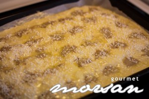 Platta sedan ut degen på smort bakplåtspapper i en långpanna. Använd lite mjöl på handflatan och degen är väldigt kletig. Gör ca 48 hål och fördela fyllningen i hålen, drygt 1 tesked i varje hål.