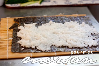 I färd med att tillreda sushi på Sushi noki blad (sjögräsblad)