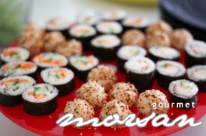 strimlad avocado, crab-sticks, räkor, lax, färsk tonfisk.