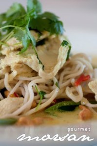 spara lite koriander till garnering. Fördela kycklingen över nudlarna,