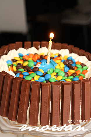 Gör så här: Sätt ugnen på 175°C. Bröa en form med diametern 24 cm. Vispa ägg och socker poröst. Blanda de torra ingredienserna och rör de försiktigt ner i smeten. Häll smeten i formen och grädda i ca 40 min. Lår svalna i formen. Stjälp upp på ett galler och låt kallna. Skär sedan kakan i tre delar. Det första lagret fyller man med vaniljkräm, de andra lagret med jordgubbssylt. Vispa grädde och bred runt tårtan. Spritsa en ring uppepå tårtan. Ställ kitkat runt och garnera med m&m uppepå.