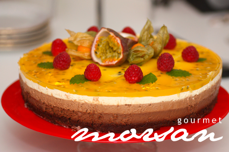 Blötlägg gelatinbladen i kallt vatten i fem minuter. Späd den koncentrerade juicen något starkare än vad som står på förpackningen (jag brukar späda 1+3 istället för 1+4) Värm 1/2 dl av juicen på svag värme i en kastrull. Ta upp och krama ur gelatinbladen, smält ett i taget i juicen. Häll i resten av juicen och rör om. Gröp ur passionsfrukterna i en skål och häll juicen över fruktköttet, rör om (ta ev. bort långa gula trådar). Låt gelén svalna något innan den skedas över moussen (gelén kan hällas på efter ca 20-30 min).