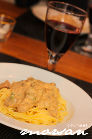 Bomans Tagliatelle med vitlöksdoftande fläskfile med senapsås.