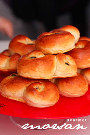 Smält smöret, och tillsätt mjölken. Låt det bli 37°C. Smula jästen i en bunke och tillsätt lite av degspadet, så jästen löser sig. Tillsätt sedan resten av degspadet, sockret, kesellan, kardemumman och ev saffran. Därefter mjölet. Knåda degen för hand eller i maskin tills den är smidig och släpper från kanterna. Låt den jäsa i bunken i 30-40 min. Ta upp den på bakbordet och knåda den lätt. Dela degen i 2 längder och forma dem till längder. Dela varje längd i 24 bitar. Rulla ändarna åt var sitt håll till smala längder, 25 cm. Forma dem till S. Lägg dem på bakplåtspapper och låt jäsa ytterligare 30-40 min. Värm ugnen till 225°C. Tryck ner russin som garnering. Pensla med uppvispat ägg. Grädda i mitten av ugnen i 5-10 minuter. Låt svalna.
