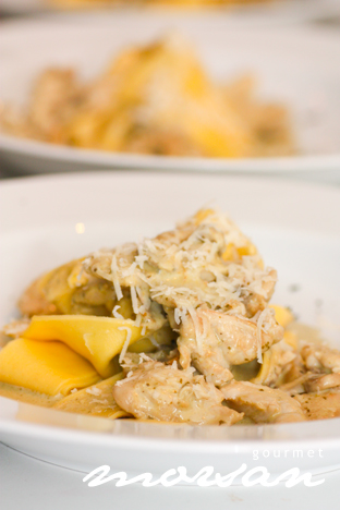 Häll det över kycklingen och tillsätt parmesanen, men låt lite vara till garnering. Låt det bli varmt. Servera det genast tillsammans med pastan….