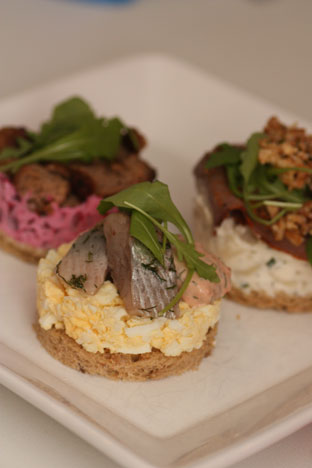 Mina smörgåsar blev äggrör med sill, Köttbullsmacka med rödbetssallad och potatissallad med rostbiff toppas med rostad lök.