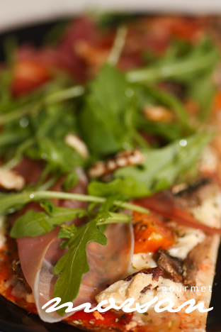 …ta ut pizzan och toppa med parmaskinka, ruccula, valnötter och ringla honung över… Yammie, Yammie!