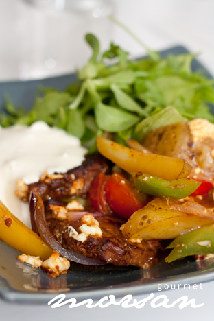 Klyfta rödlöken och paprikorna, skiva tomaterna ovanpå. Lägg på fläskfilen och häll sedan över marinaden från köttet. Strö till sist över smulad fetaost. Gratinera i ugnen ytterligare ca 20 minuter.