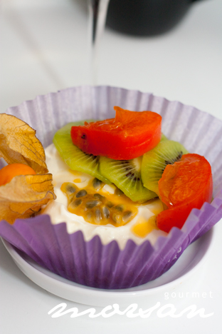 Ta ut cheesecaken ca 15 minuter innan serveringen och garnera den med frukt och bär.