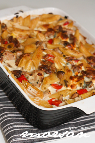 Då var det onsdag igen, och inget annat än onsdagspasta gällde ikväll! Receptet har jag fått från min svärmor som i sin tur fått det från sin syster, som kanske fått det i sin tur… Inte vet jag. Men nåt jag vet, är att det är otroligt god pastarätt! Enkel som bara sjutton, där allt blandas i en form och gratineras i ugnen, och sedan är det bara att ta ut och toppa med vad man önskar. Jag gjorde lite ändringar, så mitt recept blev så här