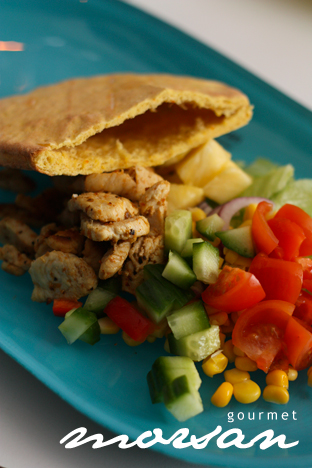 Kyckling i pitabröd med krispiga grönsaker Var och en plockar av vad man önskar att fylla sitt pitabröd med, sedan toppar man med en god dressing. I vårt fall har vi helt fastnat för Biggans curry- och mangodressing, som för tillfället används flitigt. Har ni aldrig testat den så gör det! Den smakar ljuvligt  ;)