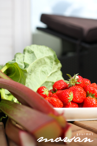 Ute har jag varit och skördat några härliga rabarber. Dessa tänkte jag hitta på något roligt med i kombo med de små små röda bären, som jag än så länge har fått inhandla. Men snart lyser de i landet, och jag riktigt längtar… Fast jag kan ju inte hålla mig, så det har redan frossats på några liter…