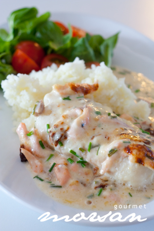 Tillaga i ugnen ca 20 minuter. Servera med pressad potatis och sallad.