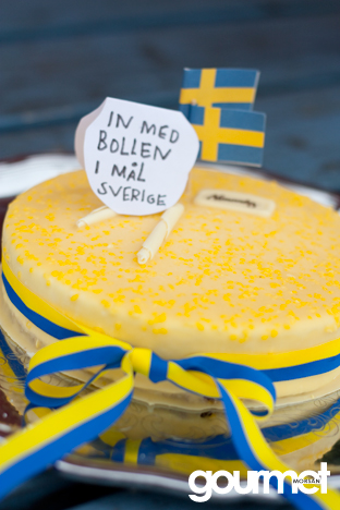 Hej på er! Här började vi ladda redan i eftermiddag inför kvällens matchen… Sverige -Ukraina. Det blev en moussetårta från Almondy med Lovely lemon Curd… härligt frisk och god! En nyhet som jag länge letat efter, men som nu finns i butikernas frysboxar! Pimpande till den lite med Sverigeband dagen till ära och mina brorsbarn prydde den med hejaramsa! Visst passade den perfekt en dag som denna? Själv blir det Harrys och matchtittande! Ska bli riktigt, riktigt trevligt!