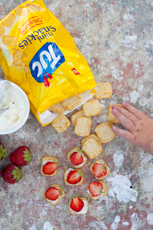 Men nu vankas det lite salta kex från Tucs och färskost och jordgubbar! Även de små fingrarna kan inte hålla sig borta från Tucs