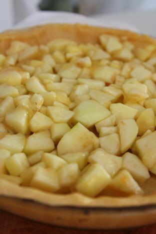 Fyllning: Skala och kärna ur äpplena. Skär dem i småbitar och lägg i en kastrull. Tillsätt sirap, vatten och potatismjöl, och låt koka under omrörning tills äpplena mjuknat, ca 3-5 minuter. Häll dem i pajskalet.