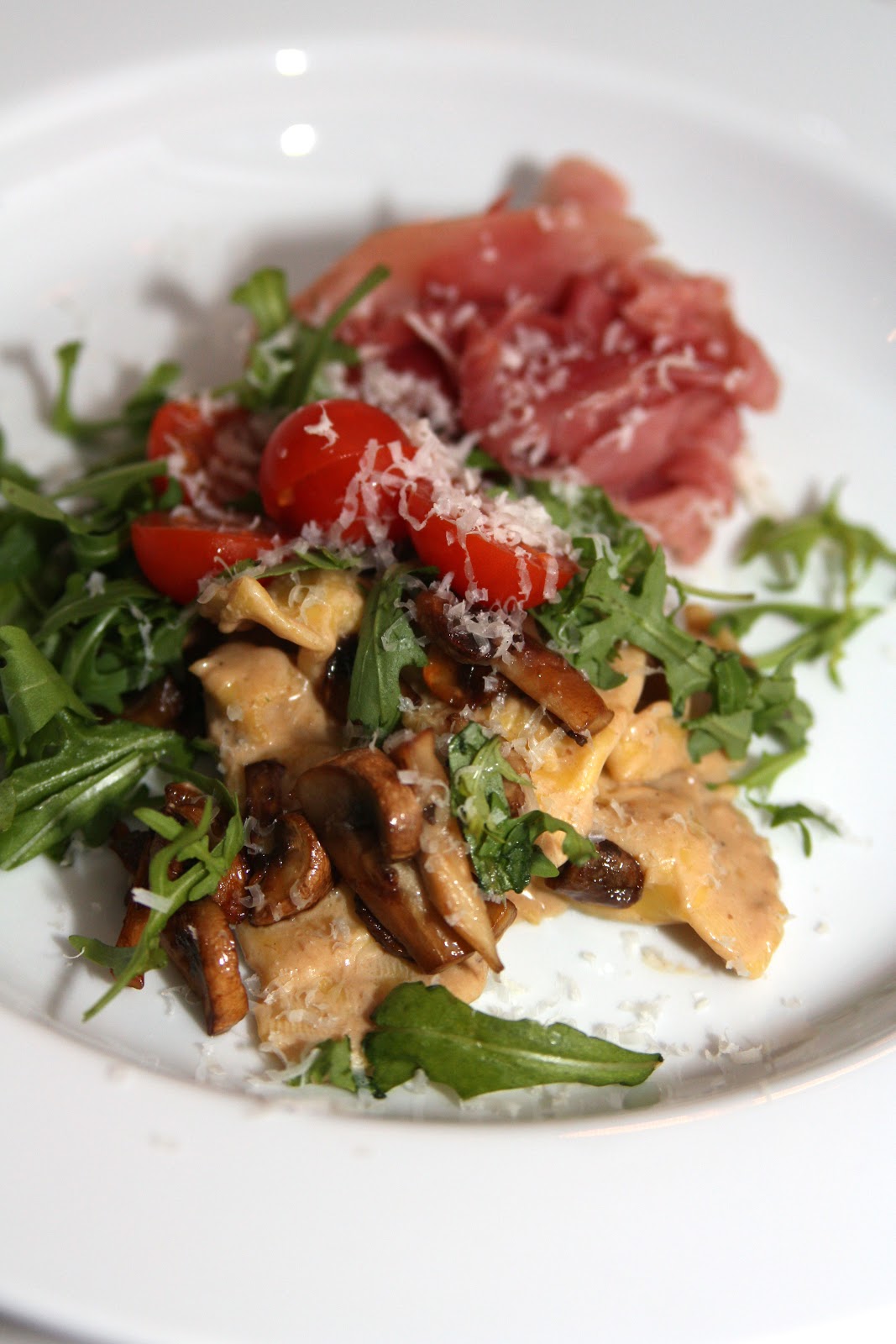 Lägg upp pastan på tallriken och strö över champinjonerna. Garnera med lite ruccula och cocktailtomater. Servera med prosciutto alt kyckling.
