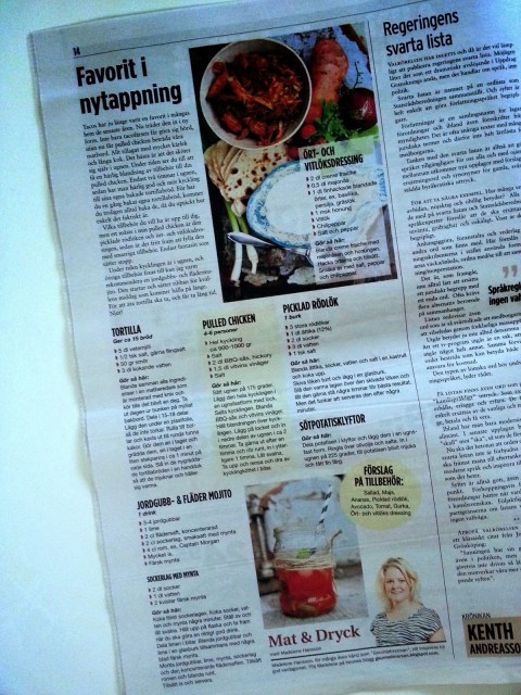 I veckans Varbergs Posten bjöd jag på en lite nytappning av fredagsmys, Pulled Chicken i tortillabröd med smarriga tillbehör. Sommaren vill vi ju hålla kvar så länge det bara går, så även en lite svlakande dryck från sommarens frukt och bär kan ni också njuta av. Har blivit riktigt poppis här hemma! Hoppas det ska smaka!