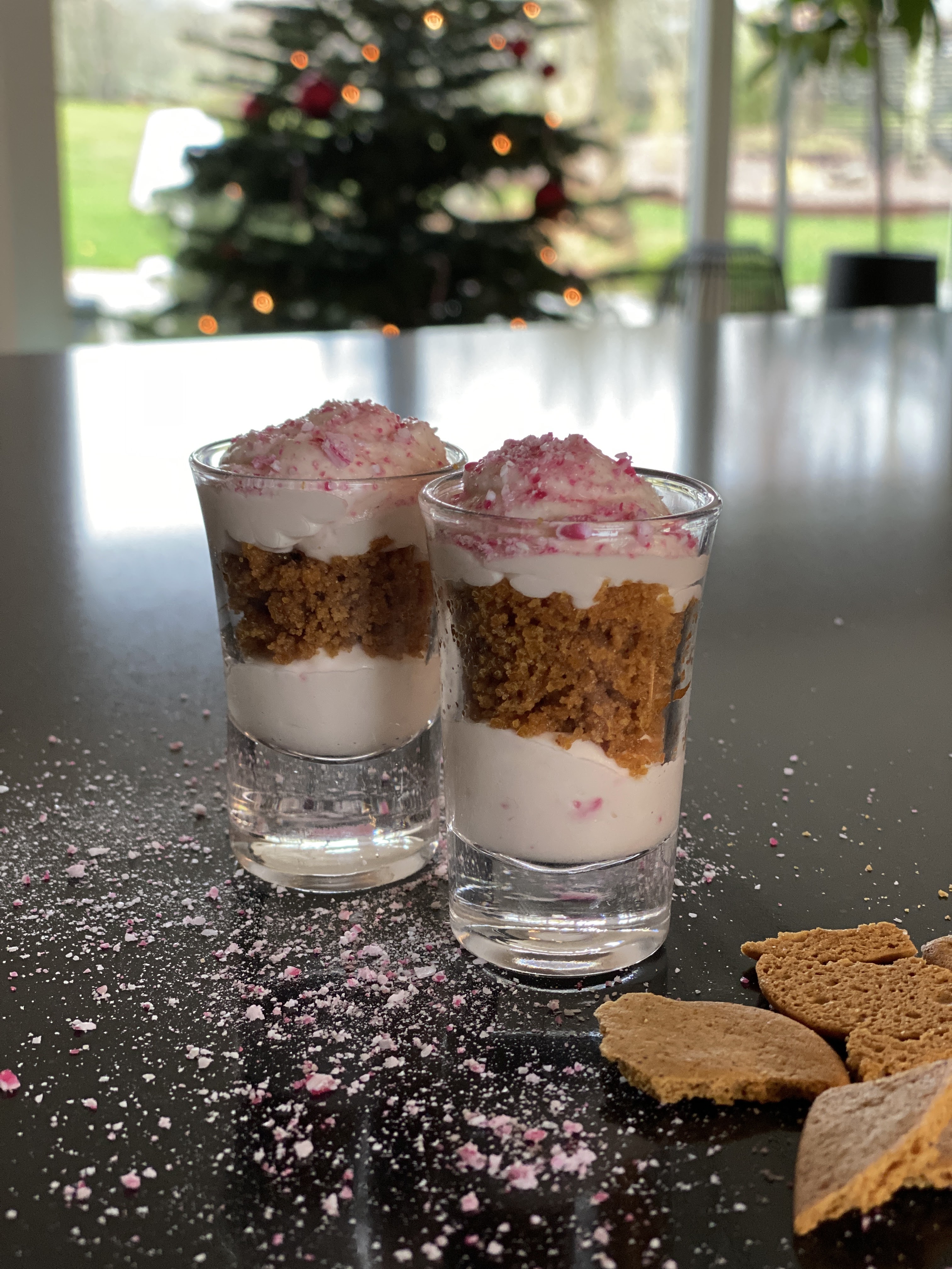 Spritsa smeten i botten på ett glas. Häll pepparkakskrosset ovanpå grädden. Sedan ytterligare ett lager med smet. Strössla över krossad polkagris. Kan garnera med polkagrisstängel.