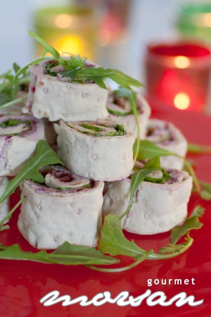 Bred oströran i ett jämnt lager på bröden och lägg köttskivor och rucola på 3/4 av varje tunnbröd (lämna sista biten tom så att oströran får fästa ihop brödet). Rulla ihop till en tät rulle.