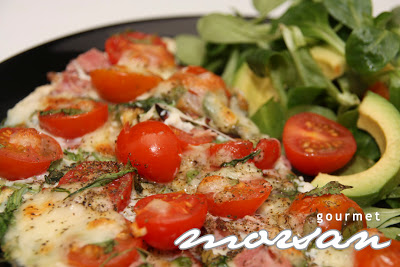 Lägg på tomater, skinka, ruccola, mozzarella,