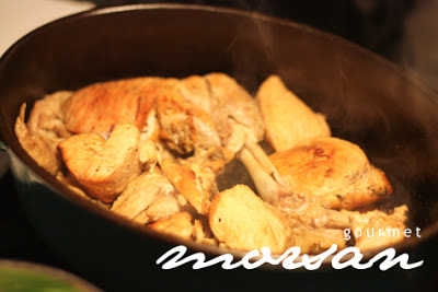 Tillsätt vatten så den inte blir så torr. Låt den småputtra, tills det börjar släppa ifrån benen.