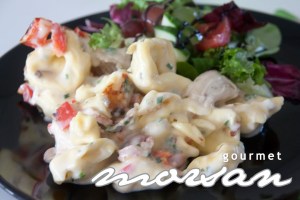 Färska pasta kuddar med färskost och bacon