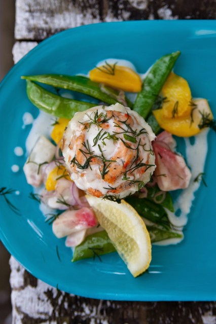 Spritsa laxfärsen i mitten. Ställ formarna på plåt alt. i en plåtmuffinsform. In i ugnen till 55°C innertemperatur på färsen, ca 20 minuter. Servera med goda grönsaker (ex. suger snaps, röd lök, klyftor av gulbeta, polkabeta) och vitvinssåsen och kokt potatis om så önskas. Garnera med dill och kräftstjärtar.