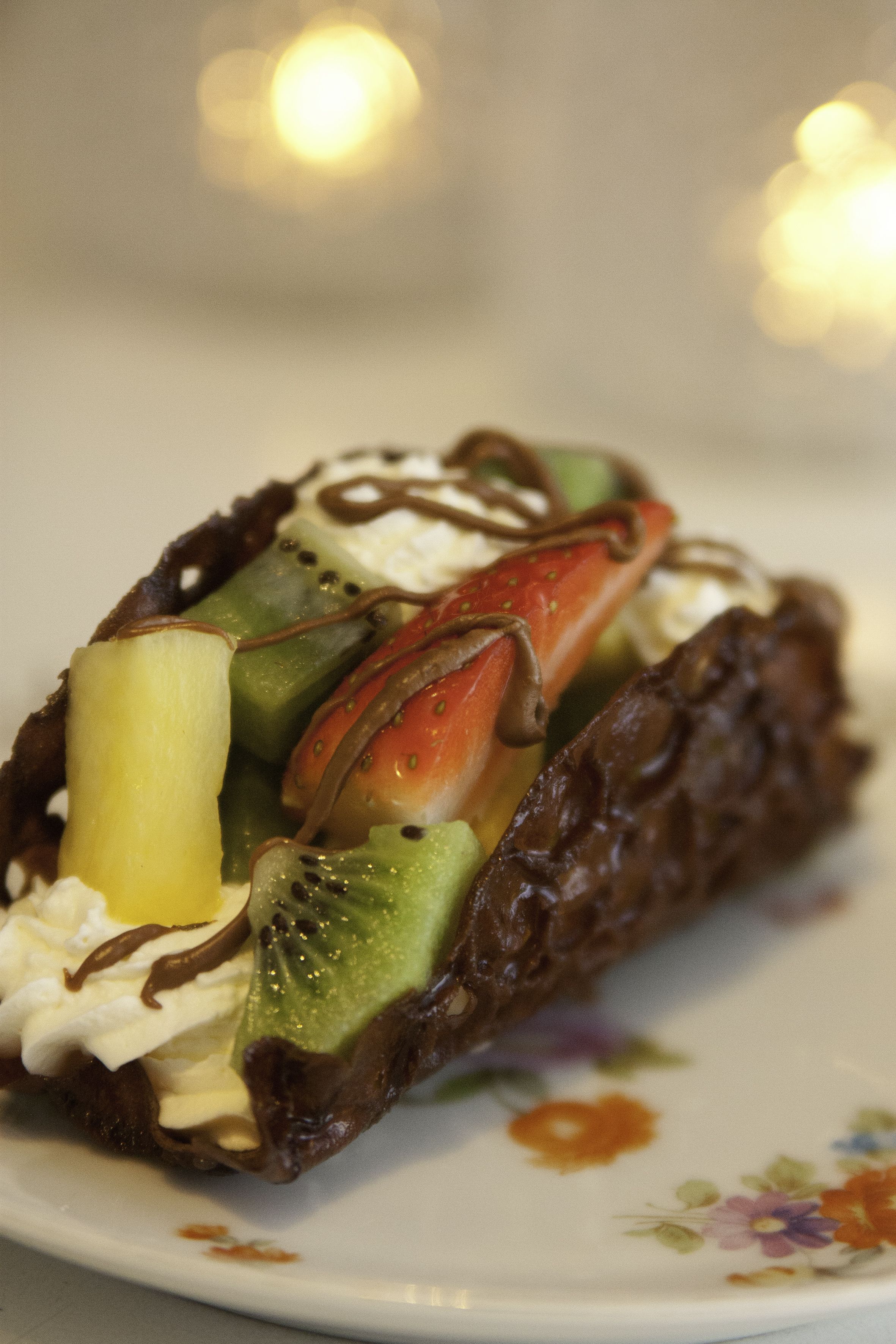 Här ska firas födelsedag! Det börjar bli många ljus på tårtan, så den bryr jag mig inte om 🙂 Det får bli en typ av tacos i dessertform. Krispigt och chokladigt med härlig färsk frukt och krämig glass. Åh det kan ju inte gå fel, eller hur? Minns min morfars rullerån och man skulle väl kunna säga att dessa är en slags nytappning av dem. Dock inte så lövtunna som de, men ack så goda. Vad man önskar fylla dem med är verkligen fritt fram. Det krävs lite tålamod eftersom de får gräddas två och två eller kanske tre och tre om du är riktigt flink i fingrarna. Annars stelnar det lite för tidigt innan du fått format till dem. Men när de svalnat och fått sin form, är det bara att fylla med krämig vaniljglass, frukt och grädde eller något annat som faller dig in. Jag hoppas du ska tycka om dem.  Mumsa och njut, det ska jag göra !