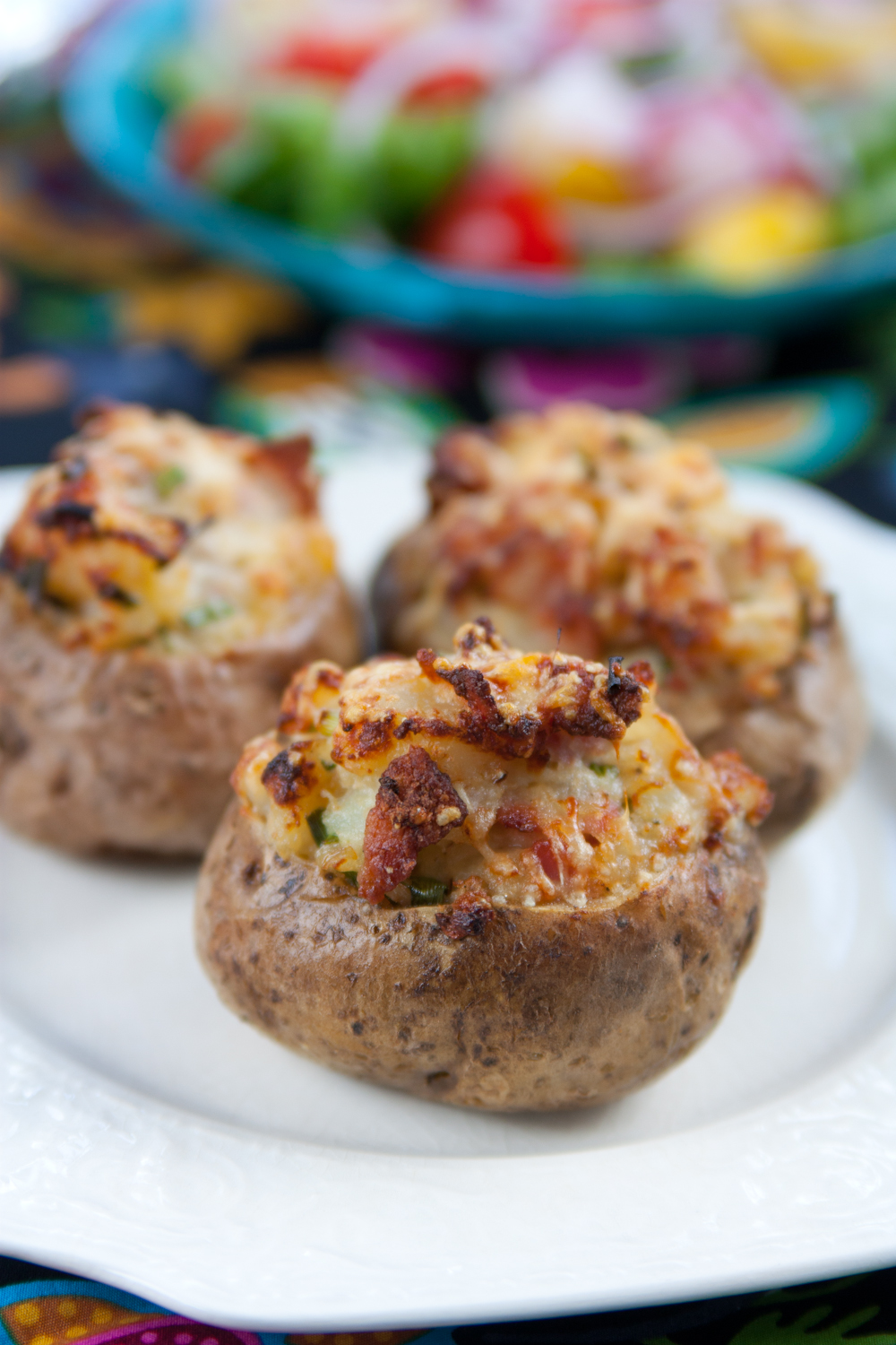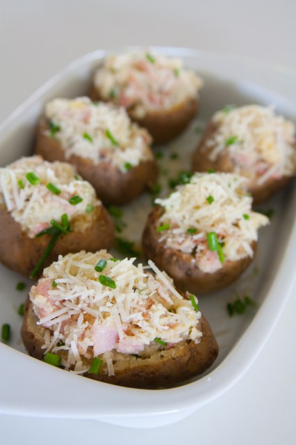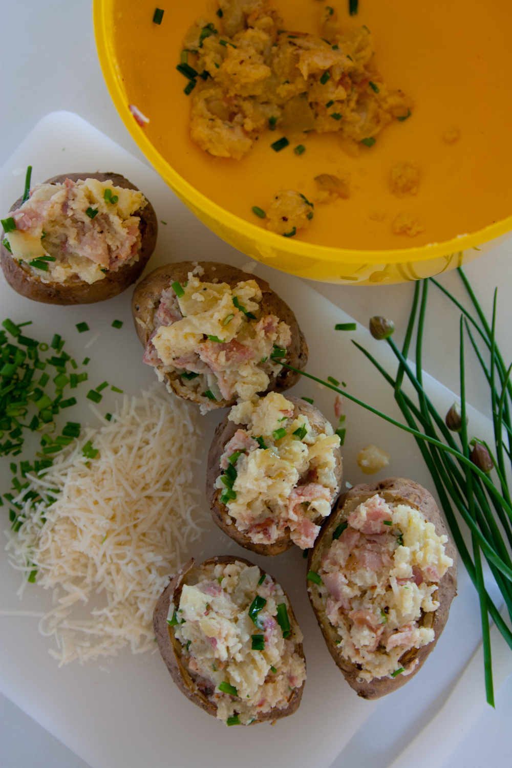 Baka potatisen i ugnen på 225°C, tills de blir mjuka. Ta ut och låt svalna något. Har man bakpotatis delarman dem på mitten, annars skär man ett lock och gröper ur dem och lägg innehållet i en bunke. Värm en stekpanna och stek de små baconbitarna tillsammans med löken så de blir gyllenbruna. Häll det i bunken tillsammans med potatisen. Blanda i crème fraiche, lite av osten, den hackade gräslöken och smaka av med salt och peppar. Fördela blandningen tillbaka i de tomma skalen och toppa med lite ost. Sedan kan man välja att tillaga de färdigt på grillen. Ca 10-15 minuter, eller i ugnen 225°C i 10-15 minuter.