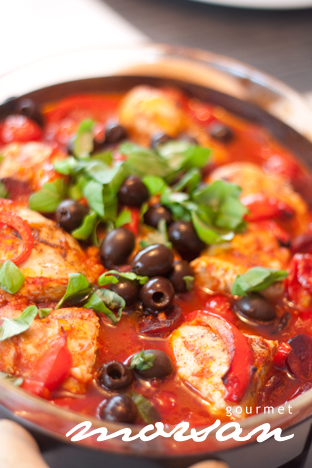 Gör så här: Dela kycklingfiléerna och salta och peppra. Stek i stekpanna så det får fin färg. Lägg dem i en ugnsfast form och häll stekskyn över. Fräs paprikan och chorizon snabbt. Tillsätt vitlöken motslutet, samt tomaterna, kycklingbuljongen och en liten skvätt vitt vin om du har, (det är inte nödvändigt). Smaka av med salt och peppar. Häll blandningen över kycklingen. Fortsätt tillagningen i ugn på 225°C i 15-20 minuter, eller tills kycklingen är klar. Innan servering tillsätt 1/2-1 pressad citron och strö en näve oliver över. Garnera gärna med färska örter, typ basilika. Servera med pasta, ris eller potatis och med en härlig grönsallad.