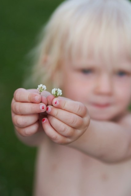 Nej, nu kommer min blomsterflicka med ännu en blomma. Med de här så bedårande små blommorna som hon ger mig (klöverblommor), så kommer jag nog snart ha en liten, med betoning på liten bukett att sätta i vasen 😉