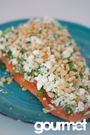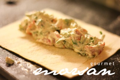 Blanda samman fyllningen. Lägg en bit plastfolie på skärbräda. Lägg ut laxskivorna omlott, och bred över fyllningen. Rulla ihop till en rulle, och förvara i kylskåp minst 30 minuter. Skär rullen i stubbar, kan serveras på rund (eventuellt rostade) brödbitar.