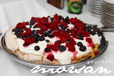 -Pavlovatårta med äggkräm, grädde och blåbär och hallon