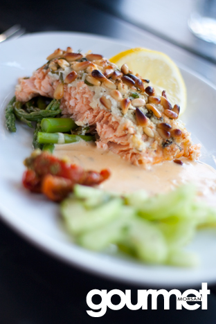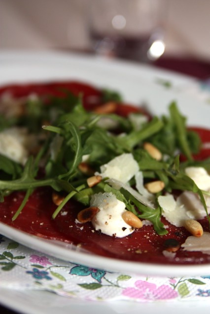 Lägg ut plastfolie på en skärbäda. Lägg ut prosciutton omlott. Strö över parmesan, och ruccula. Pressa över citron och strö över pinjenötter.