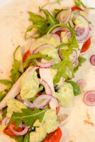 Täck en skärbräda med plastfolie och lägg ut rostbiffen omlott. Rör ihop fyllningen. och bred över rostbiffen. Lägg på avocadon på krämen. Rulla ihop till en rulle. Låt den vila i kylen i minst 30 minuter. Skär rostbiffen i ca 2,5 cm tjocka stubbar. Servera på runda (ev. rostade) brödbitar.