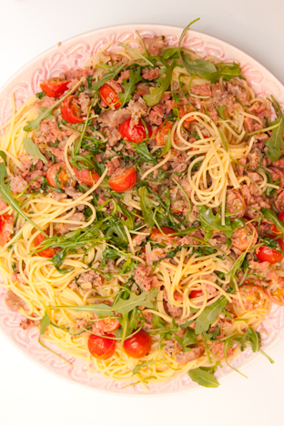 Koka pastan enligt förpackningen. Blanda tomatpeston med olivoljan. Finhacka rödlöken och blanda ihop alltsammans.