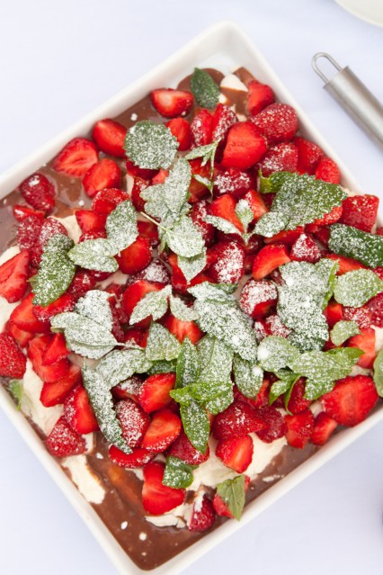 Marängtårta med kolasås, grädde och jordgubbar