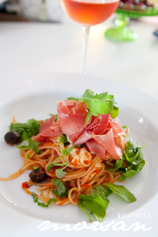 Spagetti med tomatsås, mozzarella, oliver, ruccula och parmaskinka