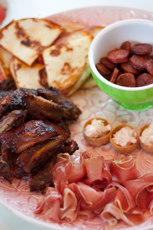 Quesadillad med salami och getost, stark chorizokorv, honungsgriljerade revben, parmaskinka och crustader med kräftsallad!