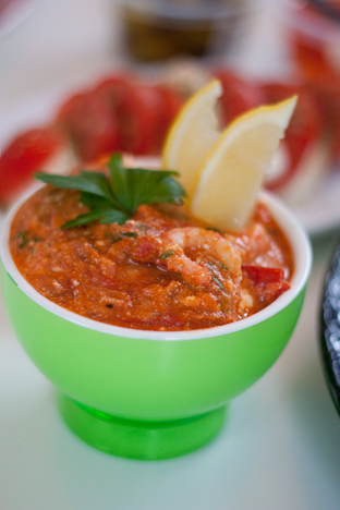 Skala och hacka gul lök, vitlök. Stek löken så den blir njuk, tillsätt en burk tomater och låt puttra i 5-10 min. Smaka av med salt, peppar och chili. Tillsätt hackad persilja och till sist räkorna. Låt de bara bli varma. Inte förlänge för så blir det lätt sega. Till sist toppa med smulad fetaost och klyftor av citron.