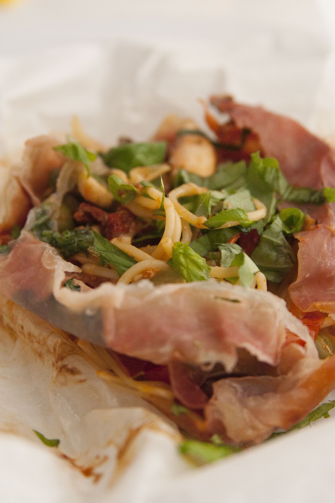Bred ut fyra smörgåspapper och börja med att lägga ut skinkan i en rektangel i mitten av varje papper. Två-tre skivor på bredden lite omlott och sedan två skivor på andra ledden på varje sida så att du får en stor rektangulär botten av parmaskinka. Lägg en hög med kokt pasta i mitten på skinkan och gör en grop i mitten. Fördela svamp och mozzarellabitar i groparna på pastan. Skeda över tomatsås och strö över strimlad basilika och riven parmesanost. Vik skinkan över fyllningen så du får fyra små paket. Vik sedan in alltihop i smörgåspapperet.