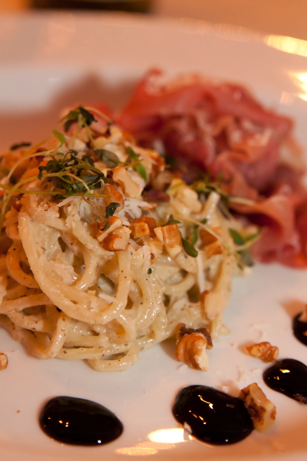 Blanda mjölk, creme fraiche och ost i en kastrull. Värm sakta till osten smält och smaka av med svartpeppar. Rosta valnötter i torr het panna och bryt dem i mindre bitar. Koka pastan enligt anvisningar oå förpackningen. Lägg i spenaten mot slutet. Häll av i surkslag. Blanda ner pastan, spenat och valnötter i den  varma såsen. Toppas med 4 skivor prosciutto på varje tallrik! Bon Appetit!