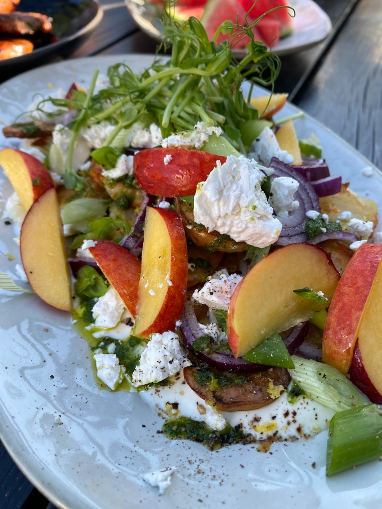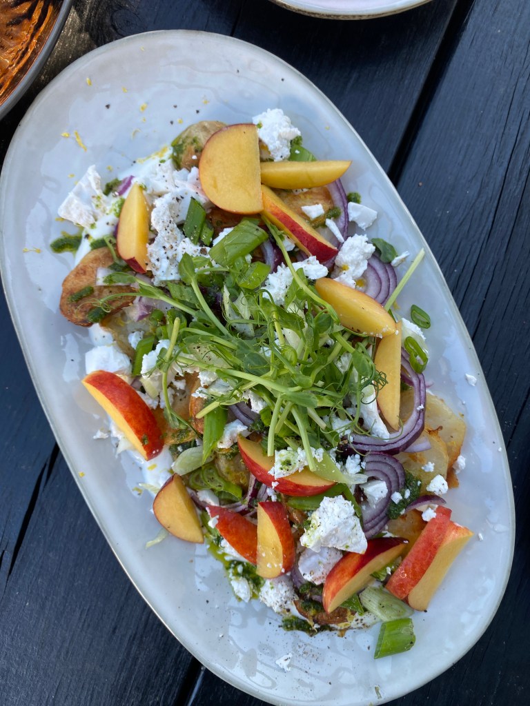 Färsk potatis i skivor Grekisk yoghurt (laktosfri om så önskas) Rödlök, i tunna skivor Salladslök i skivor Nektariner i klyftor Fetaost Citron, skal Persilja Basilika Vitlök Olivolja Salt Peppar