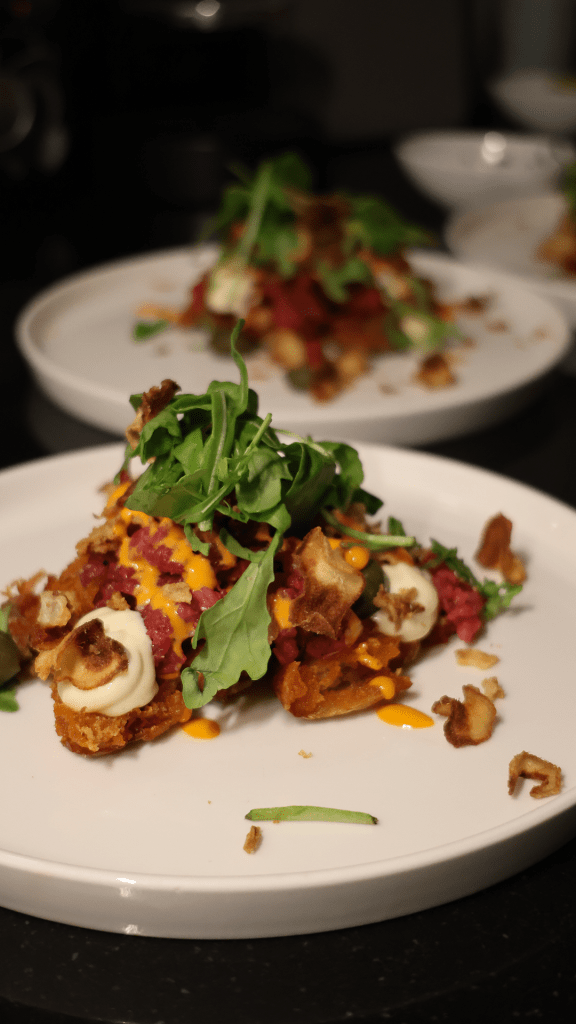 Råbiff på friterad potatisbädd med dijonnaise, sriracha och friterad kapris