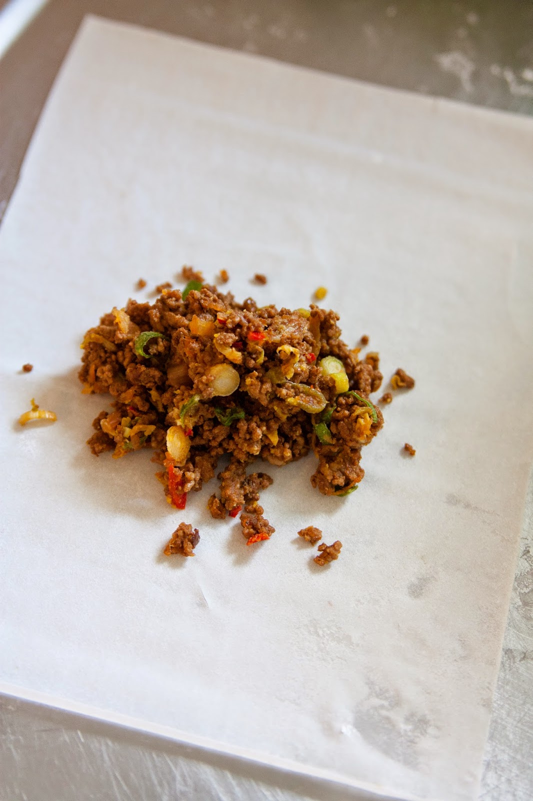 Lägg på köttfärsblandningen och vik först över ena kortsidan och vik sedan in långsidorna och rulla ihop.